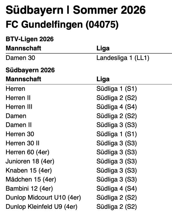 Die vorläufige. Gruppeneinteilung für die BTV-Winterrunde 2024/25 ist seit dem 25. Juli online. Die neu gebildete Damen 30 Mannschaft wurde wie gewünscht in die Landesliga 2 eingestuft. Die anderen Mannschaften wurden teilweise höher als letzten Winter eingestuft. Die namentliche Mannschaftsmeldung findet vom 09. – 22. September 2024 statt -unter Beachtung der Stichtags-LK vom 04. September 2024.