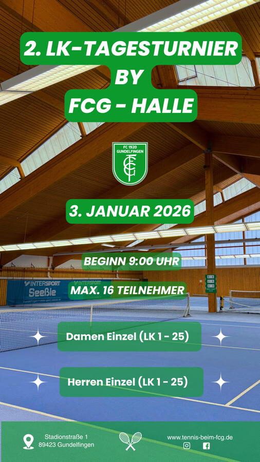 Die FCG Tennisabteilung richtet am Samstag 3. Januar 2026  ein ganztägiges LK Tagesturnier in der FCG Tennishalle für Damen und Herren aus.
